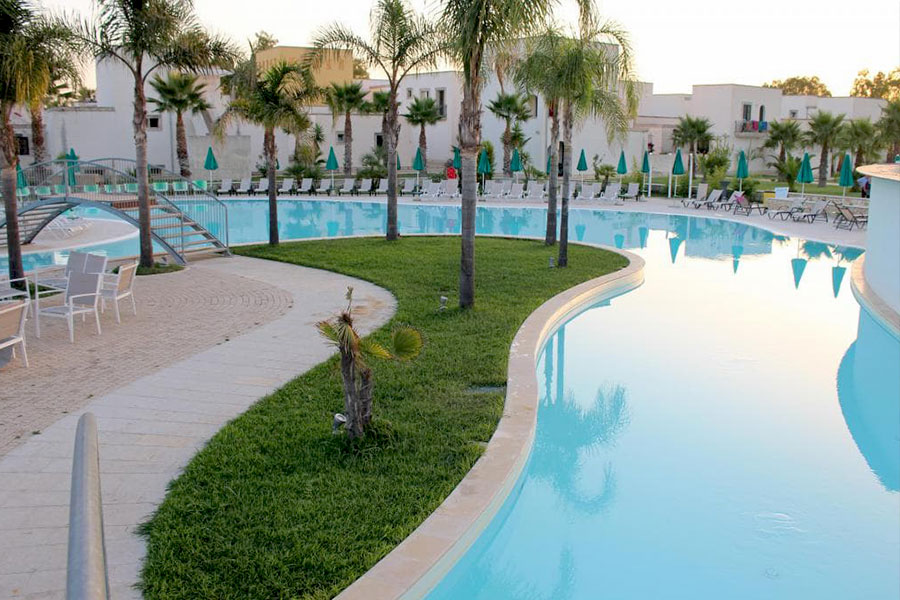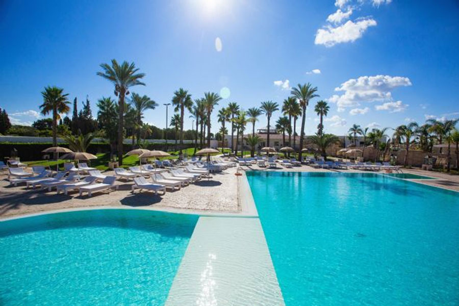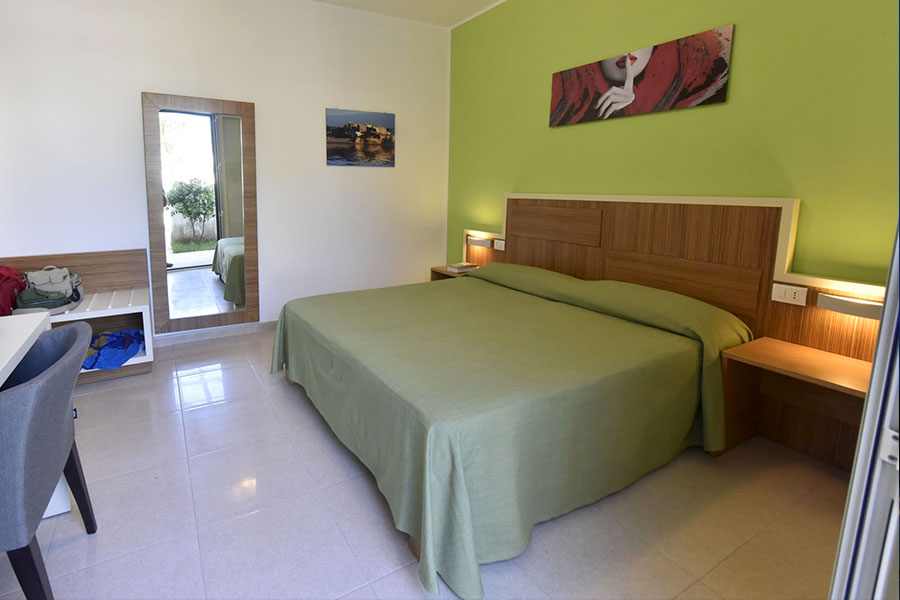 Sistemazione: Le 300 camere, totalmente rinnovate nel 2025, offrono ambienti eleganti e moderni, tutte di tipologia Superior e Deluxe e Bicamera superior. Le Superior sono ampie, luminose e arredate con gusto contemporaneo, dotate di tutti i comfort per un soggiorno piacevole e rilassante. Le Deluxe, di recente costruzione (agosto 2024), si distinguono per la posizione tranquilla e privilegiata, adiacente alla nuovissima piscina relax, con arredi moderni, spazi più ampi e particolarmente curati. Le Bicamere, composte da doppio ambiente entrambi climatizzati autonomamente composte da camera da letto e seconda camera con due letti singoli, con patio/giardino se a piano terra o terrazzino se al primo piano (le bicamere al primo piano sono senza ascensore).Tutte le camere al piano terra dispongono di patio, mentre quelle nel corpo centrale al primo piano (servite da ascensore) includono un terrazzino. Ogni sistemazione è dotata di bagno con doccia, aria condizionata, frigo, TV e telefono. Le camere quadruple sono intese come matrimoniali con terzo e quarto letto a castello, a differenza delle Bicamere Superior e le Deluxe che prevedono due ambienti separati con letti singoli.
