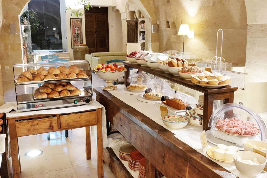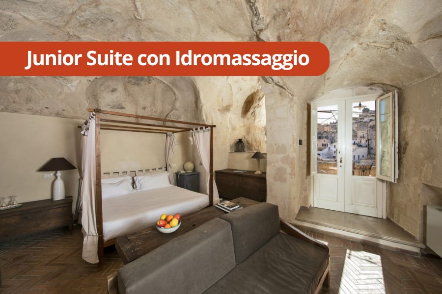 Le Camere: Junior Family Suite (max pax 4 – mq. 36-50): Camera tradizionale in grotta e/o con volta in tufo di grandi dimensioni, con vasca idromassaggio e vista sui Sassi di Matera; Junior Suite (mq. 30-35) Camera tradizionale in grotta e/o con volta in tufo, con terrazzo e vista sui Sassi di Matera. Vasca idromassaggio su richiesta; Superior Matrimoniale/Doppia In Grotta Con Vista Città (mq. 23-29): Camera tradizionale in grotta e/o con volta in tufo, con terrazzo comune e vista sui Sassi di Matera; Superior Matrimoniale/Doppia In Grotta (mq. 23-29): Camera tradizionale in grotta e/o con volta in tufo, con affaccio su vicolo o su cortile interno. Matrimoniali/Doppia non In Grotta Con Vista Città (mq. 19-22): Camera non in grotta, con vista sui Sassi di Matera.