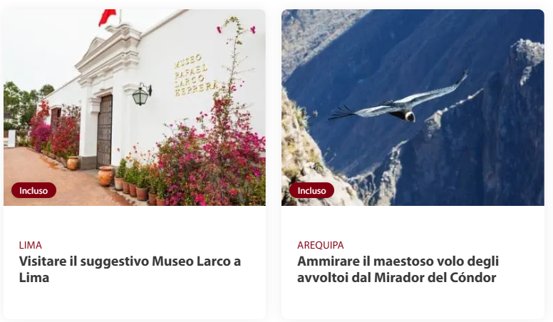 Prima colazione in hotel e partenza in pullman privato verso la Valle del Colca e il paesino di Chivay, attraversando la Pampa Cañahuas all’interno della Reserva Nacional de Salinas y Agua Blanca. In questa cornice di impareggiabile bellezza si incontrano esemplari della fauna locale, come l’alpaca, il lama, il guanaco e soprattutto la vigogna, un camelide simile al lama dalla lana molto pregiata, che vive allo stato brado. La strada si snoda sinuosa lungo i fianchi delle montagne fino al Mirador de Los Andes, situato a quattromilanovecentodieci metri di altitudine, per poi scendere tra paesaggi segnati dai caratteristici campi a gradoni, eredità dell’epoca precolombiana. Durante il periodo incaico e preincaico furono infatti costruiti molteplici terrazzamenti destinati alla coltivazione dei cereali e quelli più facilmente accessibili sono utilizzati ancora oggi. Arrivo a Chivay situata a tremilaseicento metri di altitudine, pranzo in ristorante locale e trasferimento in hotel (area di Chivay). Pomeriggio a disposizione per attività facoltative o per riposare e adattarsi gradualmente all’altitudine. Chi lo desidera potrà recarsi agli stabilimenti termali della zona (Chacapi o La Calera), a pochi chilometri dalla località di soggiorno, dove alcune piscine con acqua termale calda si aprono tra le imponenti pareti del Cañón del Colca, per un’esperienza immersiva nella natura (facoltativo e a pagamento). Cena libera e pernottamento in hotel.