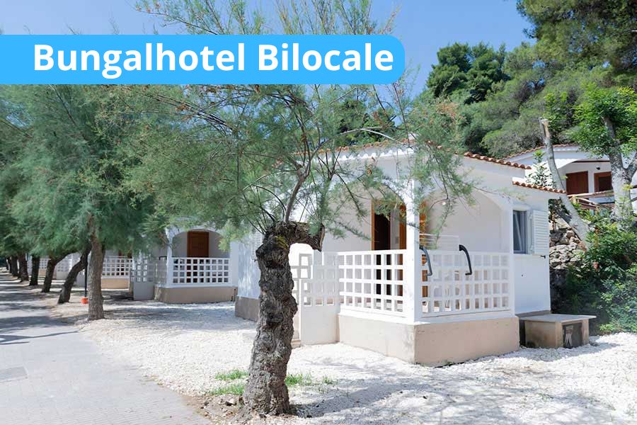 - Bungalow bilocale 4/5 posti letto: - Camera con letto matrimoniale e soggiorno con letto a castello, angolo cottura, TV-Led. aria condizionata, mini-frigo. cassaforte; servizi privati con box doccia e phon; veranda coperta, attrezzata con tavolo e sedie da giardino (25mq). Nel 5 posti letto, di 30mq, disponibile una poltrona letto aggiuntiva nel soggiorno. I bungalow/appartamenti in "zona Punta" offrono una splendida vista sulla baia e sul mare antistante.
