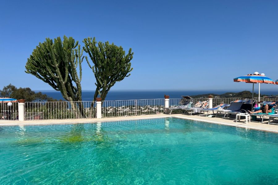 Posizione: in originale architettura mediterranea, riesce a coniugare felicemente mare e monti: la sua splendida posizione immersa nel verde a mezza costa sulla strada "Vecchia Borbonica", che collega Forio a Lacco Ameno (località Fango), offre ai suoi ospiti una calda atmosfera per una vacanza a casa di amici.