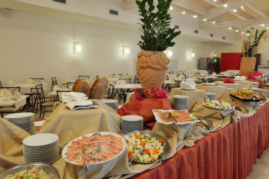 RISTORAZIONE E BAR: Il ristorante "Scirocco", con sala interna e gazebo esterno, recentemente ampliata, riesce ad ospitare fino a 600 persone. Gli ospiti potranno prenotare in Pensione Completa con servizio a buffet e primi piatti show cooking, una cena tipica a settimana; acqua, vino, birra e soft drinks da dispenser inclusi ai pasti. Il ristorante "Sottovento" in spiaggia e la pizzeria, entrambi su prenotazione, aperti a discrezione della direzione. Possibilità, su richiesta alla prenotazione, di cucina per celiaci (forniti alimenti base, non garantita assenza di contaminazione). Per i piccoli ospiti 0-3 anni n.c., obbligatorio ed a pagamento, accesso ad orari stabiliti alla biberoneria (latte fresco, omogeneizzati, 3 diversi tipi di pastine, brodo di carne, pesce e verdura), culla o sponda anticaduta, vaschetta per il bagno, scaldabiberon in camera, seggiolone, tovagliette colorate con posate, passeggino a disposizione, un piccolo gadget per i più piccoli, Tv con canali per bambini, servizio lavanderia per bambini (max 1 kg al giorno). Un bar centrale ed un bar in spiaggia.