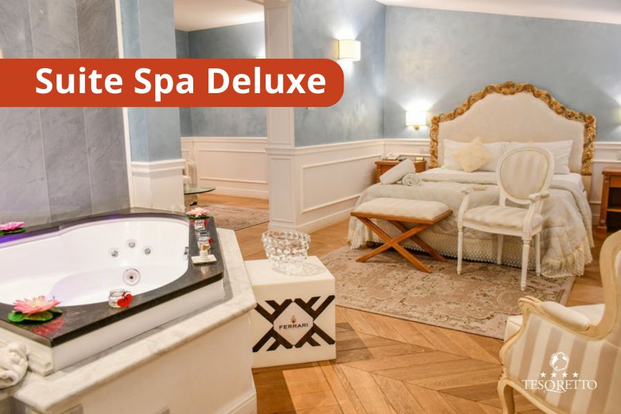CAMERE: Ogni Suite è dotata di vasca idromassaggio JACUZZI®️ più cromoterapia si completa dal percorso spa con doccia emozionale dotata di idromassaggio , cromoterapia , cascata emozionale e cascata cervicale. Tutte le camere hanno un’uscita su balcone privato e sono dotate di bagni privati. Ogni bagno è dotato di doccia, asciugacapelli, servizio cortesia che include: gel doccia, gel intimo, cuffia per la doccia, set dentifricio e spazzolino, rasoio, fazzoletti, lustrascarpe e pantofole. Per ogni componente della camera riserviamo un accappatoio ed un set di asciugamani sia di spugna che di lino che viene cambiato due volte al giorno dal nostro staff. In alternativa, secondo le esigenze dei nostri clienti, due bagni sono con vasca idromassaggio. Il Tesoretto propone camere tutte dotate di aria condizionata, di TV satellitare con schermo LCD e di balconi arredati. Potrete godere di viste piacevoli sul parco e di connessione internet wireless gratuita.