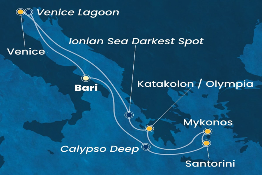 Servizio in cabina 24 ore su 24, TV LCD interattiva a schermo piatto con video/movie su richiesta, TV satellitare, aria condizionata, minibar, cassaforte, asciugacapelli, telefono - Voltaggio : 220/115 Volt/60 Hz. Consegna giornaliera su richiesta del menù del pranzo e della cena in cabina, scelta di cuscini, di accappatoi e pantofole per tutta la durata della crociera, kit di prodotti da bagno.