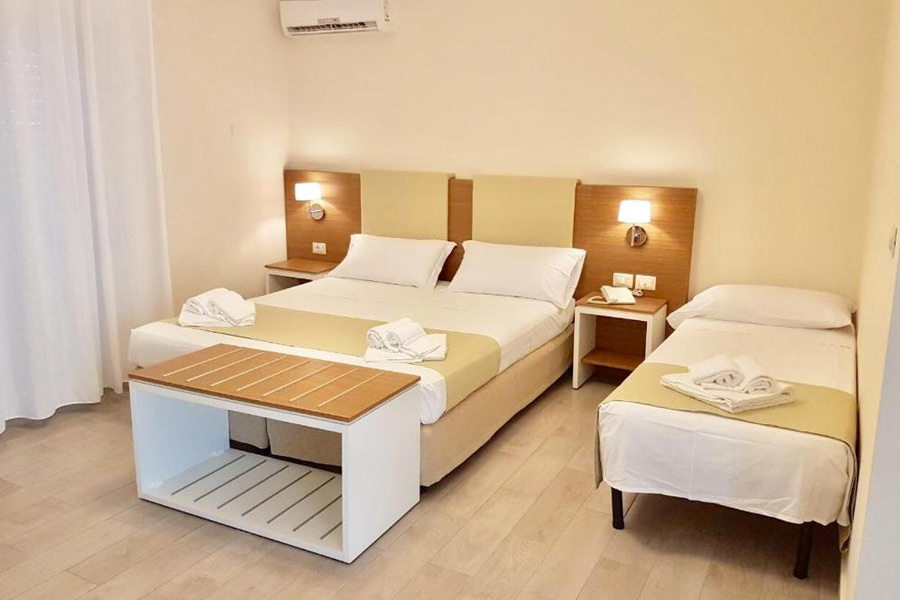 Sistemazioni: Camere per 2/4 persone, completamente rinnovate, distribuite in 7 diversi edifici all'interno del Villaggio, al piano terra, primo o secondo piano, tutte con balcone, tv, telefono, minifrigo (non rifornito), cassaforte, aria condizionata, servizi con asciugacapelli. Disponibili camere piano terra con vista interna. Le camere per 3/4 persone possono essere triple e quadruple o doppie/triple con letto aggiunto. Inoltre, il villaggio inoltre dispone di 20 bilocali di recentissima costruzione, situati sempre all'interno del complesso ma in posizione tranquilla e riservata, composti da una camera matrimoniale e una seconda camera con due letti singoli, ideali per famiglie che cercano maggiore privacy e spazio.