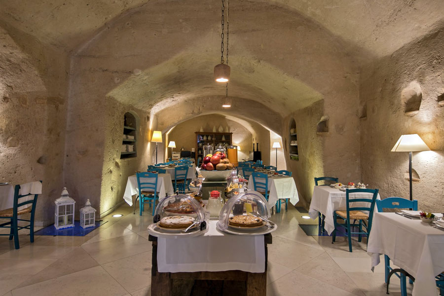 Le Camere: Junior Family Suite (max pax 4 – mq. 36-50): Camera tradizionale in grotta e/o con volta in tufo di grandi dimensioni, con vasca idromassaggio e vista sui Sassi di Matera; Junior Suite (mq. 30-35) Camera tradizionale in grotta e/o con volta in tufo, con terrazzo e vista sui Sassi di Matera. Vasca idromassaggio su richiesta; Superior Matrimoniale/Doppia In Grotta Con Vista Città (mq. 23-29): Camera tradizionale in grotta e/o con volta in tufo, con terrazzo comune e vista sui Sassi di Matera; Superior Matrimoniale/Doppia In Grotta (mq. 23-29): Camera tradizionale in grotta e/o con volta in tufo, con affaccio su vicolo o su cortile interno. Matrimoniali/Doppia non In Grotta Con Vista Città (mq. 19-22): Camera non in grotta, con vista sui Sassi di Matera.