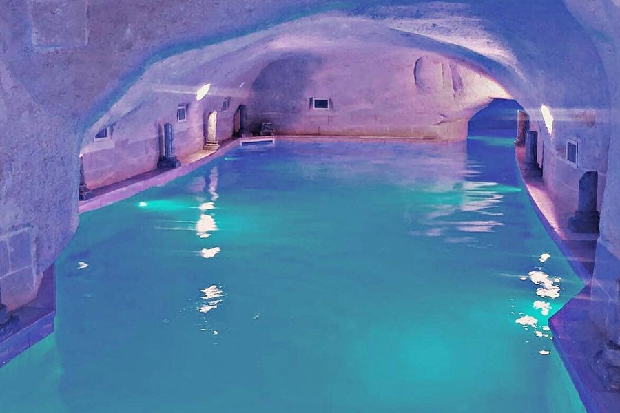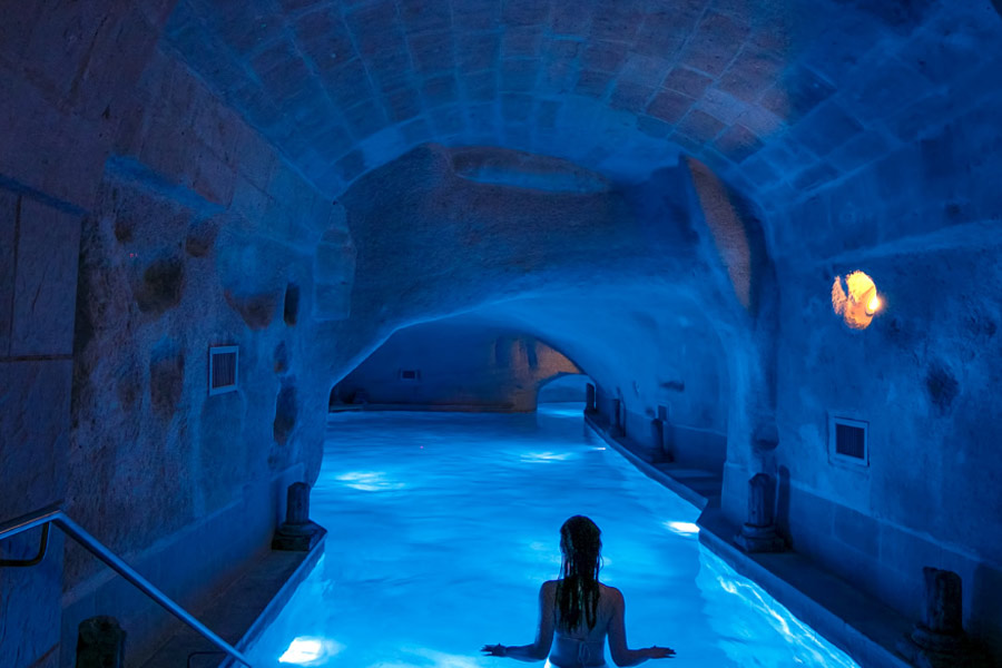 Spa: Le Antiche Termae Romanae della Locanda di San Martino sono un sito rituale consacrato al mito della Medusa. Vi muoverete attraverso cunicoli e cisterne in un luogo senza tempo dove suoni, luci e colori vi riporteranno nella quiete del grembo materno. Dopo esservi cambiati nell’apodyterium (spogliatoio), coperti di un telo, accederete all’anti-tepidarium (temperatura 28°) per una tiepida doccia cromoterapica. Da qui scenderete nel calidarium o hammam (temperatura >50° – umidità 100%) per immergervi in un bagno di vapore che dilaterà i vasi sanguigni, allontanerà lo stress e vi lascerà in uno stato di piacevole spossatezza. Risalite verso la camera di caldo secco (sauna, temperatura >50°) per allentare la tensione, aprire i pori e lavar via ogni impurità. Passate alla biosauna al fieno greco (temperatura 40°, umidità 40%) per iniziare a raffreddare il corpo, e a seguire rigeneratevi con una doccia fredda che stimolerà la circolazione sanguigna venosa. Continuate il percorso sdraiandovi sulle chaise longue nella vasca idromassaggio in pietra per un massaggio completo. Concludete il percorso con una nuotata rilassante e tonificante nel frigidarium (29°), la piscina in grotta in fondo alla quale troverete una cisterna con idromassaggio per piedi e zona lombare. Nella cisterna con cromoterapia del tepidarium (temperatura 30°) potete rilassarvi gustando una tisana biologica e abbandonandovi agli effetti luminosi e sonori dell’acqua che scorre. Il percorso benessere ha una durata massima di 90 minuti.
