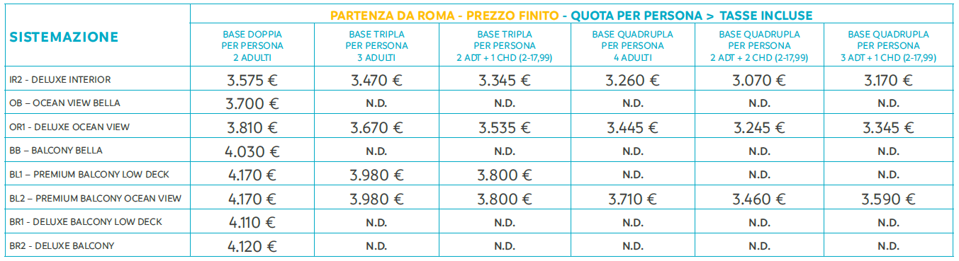 Ampio armadio . Bagno con doccia. TV interattiva. Telefono. Possibilità di collegamento ad internet (a pagamento). Minibar e cassaforte . Aria condizionata Superficie di circa 17 mq. Cabine Vista Mare disponibili: Bella, Fantastica Deluxe con vista ostruita o totale