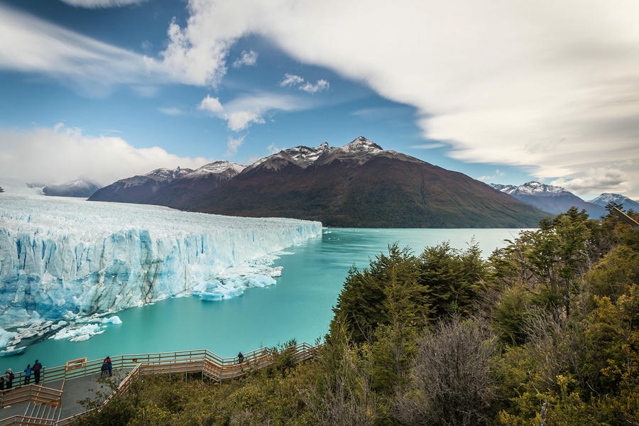 Escursione al Ghiacciaio Perito Moreno. Servizio privato con Guida parlante in italiano. Giornata intera (8 ore, 160 Km). Ingresso Parco Nazionale incluso. Partenza dall’hotel con destinazione il Ghiacciaio Perito Moreno, situato nel Parco Nazionale Los Glaciares a 80 km dalla città di El Calafate. Da subito il viaggio riserva delle belle sorprese. Uscendo dalla città, sul lato destro del cammino, si può osservare il Lago Argentino con la Bahia Redonda, che presenta una grande varietà di specie di uccelli. Durante i primi 50 km, il tragitto si svolge attraverso la steppa patagonica. Quando si entra nel Parco Nazionale si percepisce invece un cambio drastico nella vegetazione che si arricchisce con specie tipiche del bosco andino-patagonico: specialmente faggi, lengas e ciliegi, tra i tanti. Il ghiacciaio è un impressionante fiume di ghiaccio con una superficie di 257 km quadrati, una lunghezza di trenta km ed un fronte di quattro km. L’altezza della parete frontale varia tra i 50 ed i 60 metri sul livello del lago. Nella parte centrale del ghiacciaio, il ghiaccio ha una profondità tra i 250 ed i 300 metri. Questo fiume congelato scende dal campo del ghiaccio continentale e provoca, durante il suo lento avanzare, distacchi e spaccature che fanno del ghiacciaio una meraviglia in continuo movimento. Si tratta di uno spettacolo che impressiona non soltanto per la sua bellezza visiva, ma anche per i costanti rumori che si sentono dal suo interno, che gli è valso la nomina di Patrimonio dell’Umanità. Durante l’escursione, una camminata lungo le passerelle situate di fronte al ghiacciaio, permette di ammirare questa imponente meraviglia della natura da diverse prospettive. Conclusa la visita, s’intraprende la via del ritorno a El Calafate per arrivare infine in hotel. Cena in Cerro Calafate Hotel - Bevande analcoliche incluse.