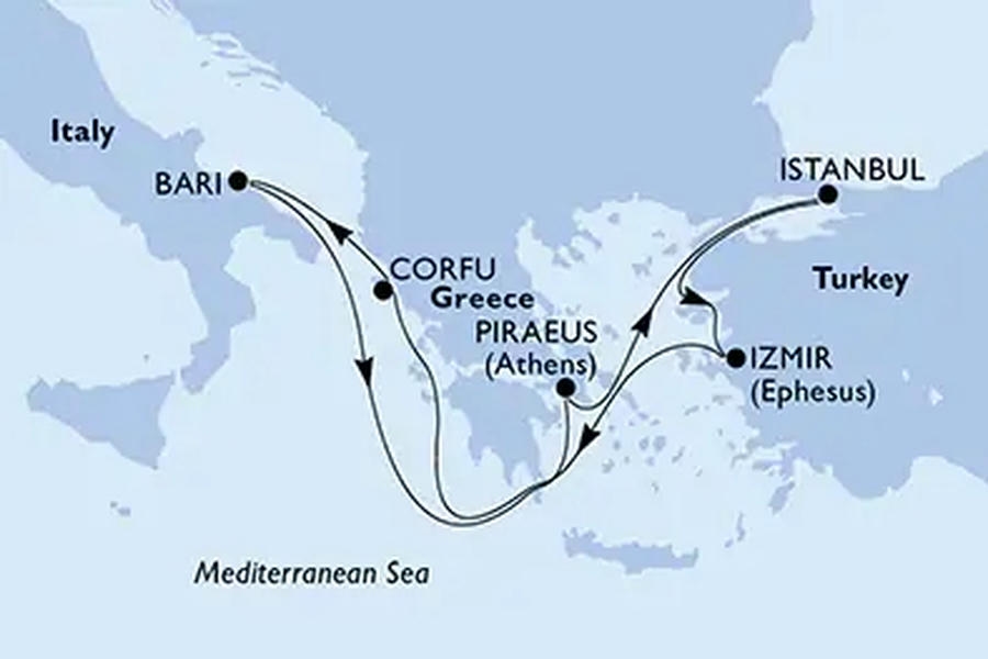 Stazza lorda 58.600 Lunghezza 251 metri Larghezza 28 metr Numero di ascensori 9 Anno di costruzione 2002 Numero di passeggeri 2.200 Numero di ponti 13 Numero di piscine 2 Numero di cabine 777 Famiglia e bambini - I bambini di tutte le età ameranno il parco acquatico pieno di divertimento e giochi ad acqua e le altre nuove e divertenti aree dedicate al gioco. Dalla sala giochi Pinocchio all'area dedicata per adolescenti, abbiamo collaborato con partner d'eccellenza quali Chicco, LEGO® e Namco®. Fitness e relax - Le opzioni per sport e tempo libero soddisferanno tutti i gusti e le età, dall’innovativosimulatore di golfe i videogiochi, al lussuoso complesso piscina, senza dimenticare la palestra completamente attrezzata e la MSC Aurea Spa con i suoi trattamenti di bellezza moderni e gli esotici massaggi balinesi. Intrattenimento e tempo libero - Dal sontuoso Casinò San Remo alla discoteca panoramica Pasha Club, fino alle linee raffinate del Teatro San Carlo o la nuovissima aree per musica e balli da 319 metri quadrati, MSC Sinfonia vanta un'incredibile varietà di aree eleganti dedicate all'intrattenimento.