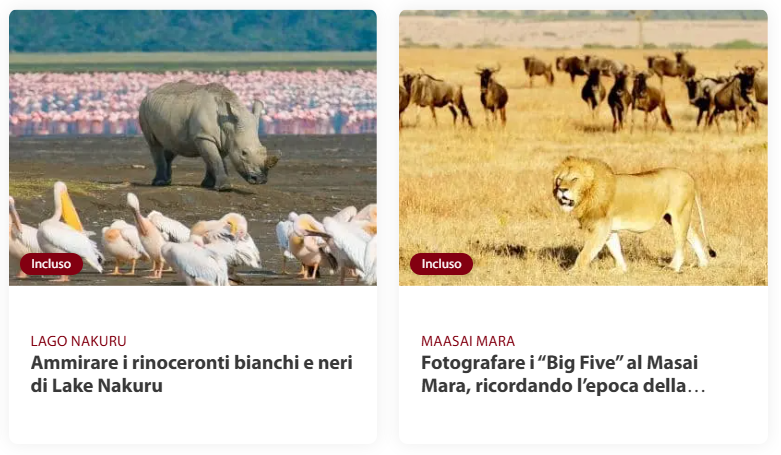 Prima colazione al lodge e partenza in veicoli 4x4 verso la Great Rift Valley, l’imponente frattura geologica che attraversa il continente africano da Nord a Sud, caratterizzata da una lunga serie di suggestivi laghi alcalini. Tra questi si distingue il pittoresco Lake Nakuru, situato a 1.754 metri di altitudine all’interno di uno dei parchi nazionali più rappresentativi del Kenya. Il lago è un importante santuario naturalistico, noto per l’incredibile varietà di uccelli, con oltre quattrocento specie, tra cui il raro falco giocoliere. L’area è famosa soprattutto per la maestosa colonia di fenicotteri, che può contare da uno a due milioni di esemplari. La loro presenza nelle acque basse del lago crea un tappeto rosa suggestivo e inconfondibile, immortalato anche nel film “La Mia Africa”. All’arrivo, sistemazione al lodge e pranzo. Nel pomeriggio, primo fotosafari nel parco alla scoperta della sua straordinaria fauna. Rientro al lodge per cena e pernottamento.