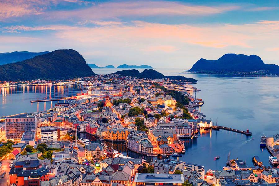 Colazione in hotel. Partenza attraverso scenari mozzafiato per la deliziosa cittadina di Ålesund, una vera e propria città museo che sorge su piccole isole collegate tra loro e che vive di attività pescherecce. Arrivo nel pomeriggio e tempo a disposizione con l’accompagnatore per la scoperta di questo gioiello della Norvegia. Pernottamento Hotel Noreg o similare.