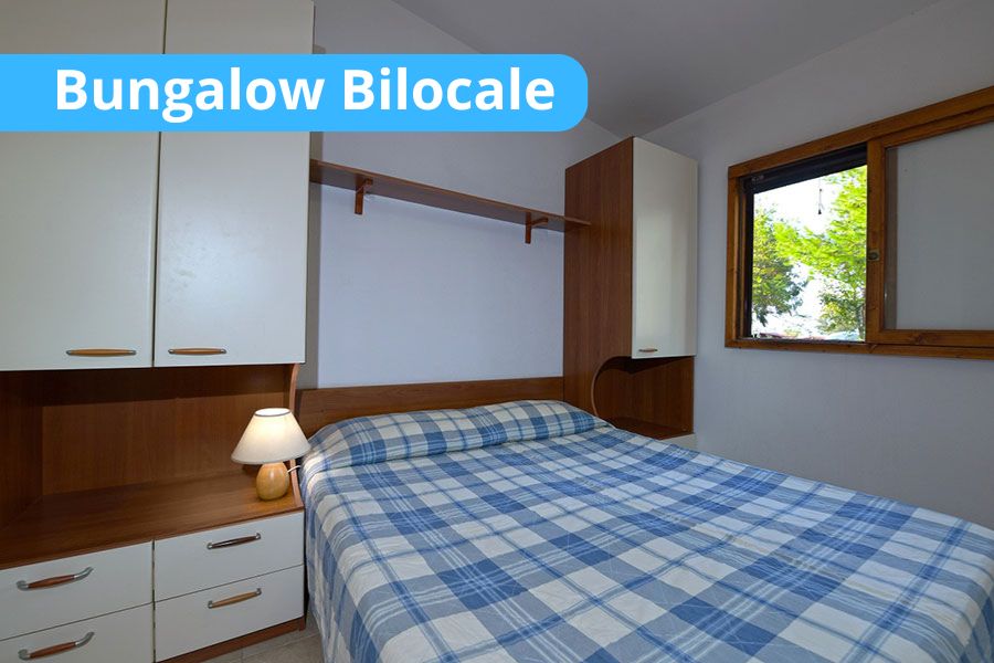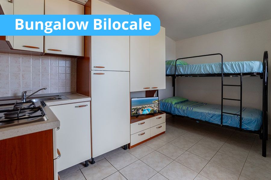 - Bungalow trilocale 6 posti letto: - Camera con letto matrimoniale e cameretta con 2 letti a castello: soggiorno con angolo cottura di cortesia, TV-Led, aria condizionata, cassaforte e servizi privati con box doccia e phon: veranda coperta, attrezzata con tavolo e sedie da giardino (ca. 40mq).