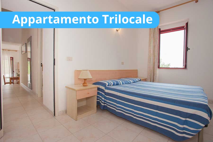 - Appartamento trilocale 6 posti letto: - Due camere con letto matrimoniale e soggiorno con angolo cottura di cortesia e letto a castello o divano letto doppio, TV-Led, aria condizionata, cassaforte e servizi privati con box doccia e phon: veranda coperta, attrezzata con tavolo e sedie da giardino (ca. 45mq). Alcuni di essi dispongono di doppi servizi.