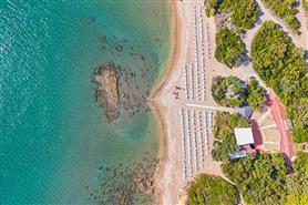 Spiaggia: Spiaggia di ghiaia e sabbia con una forma a T (darsena) con accesso diretto dall'interno del Villaggio tramite sottopassaggio. La spiaggia è riservata, dotata di 1 ombrellone e 2 lettini a unità abitativa (incluso nel servizio spiaggia obbligatorio a pagamento dalla 4° fila in poi).